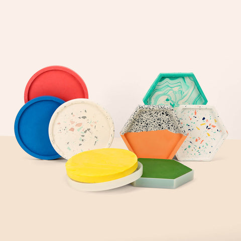 Il Jesmonite & Terrazzo Craft Kit include abbastanza materiali in modo da poter creare abbastanza pezzi per diversi kit di stampi da tenere per te e anche da regalare a qualcun altro. Tutti gli stampi sono riutilizzabili, quindi se hai voglia di diventare ancora più creativo puoi prendere un po' di liquido e polvere Jesmonite e Terrazzo per portare ulteriormente il mestiere.